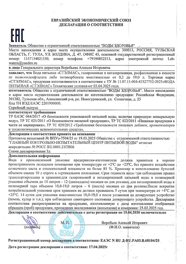 «STELMAS» — это вода для жителей мегаполисов. В ней содержатся микроэлементы цинк (Zn), селен (Se), йод (I), хром (Cr), которые крайне дефицитны у жителей мегаполисов. Наша пища бедна этими минералами (удобрение, термическая обработка, консервирование, и т.д.). Если Вы будете ежедневно пить 2-2,5 литра воды «STELMAS»,то Вас удивит насколько меньше проблем со здоровьем может быть всего лишь употребляя правильную артезианскую воду.